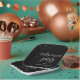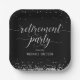 These elegant and festive retirement party paper plates feature silver (simulated foil) confetti with matching letters that say "Retirement Party" in a beautiful script font. The background color is black, but can be changed to any color of your choice.