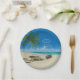 This custom design can be personalized with your name and date. The words "Happy Retirement" in a hand written script font adorn this coastal tropical sandy beach illustration with a view of a palm tree, boat, rocks, and a turquoise blue sea. The color of the off white typography can be changed in the Edit Menu.