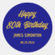 Retro fonts create a bold envelope gold and navy blue envelope seal. 4 lines of text let you customize your message. The first two lines here say Happy 80th Birthday in a bold retro script. The last two lines are in a simpler san serif. They provide the birthday celebrant's name and birthday. I designed this for maximum flexibility. You can change the background color and add your own graphics if you want.