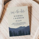 This retreat to the mountains save the date card is perfect for a modern wedding. The design features a serene blue watercolor mountain range with a forest of evergreen trees in the foreground.
