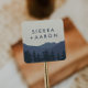 These retreat to the mountains wedding envelope seals are perfect for a modern wedding. The design features a serene blue watercolor mountain range with a forest of evergreen trees in the foreground. Personalize the label with the names of the bride and groom.