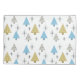 A festive mid century modern art design with atomic age style christmas trees in gold, silver and light blue, and starbursts.