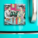 Retro pop art comic book style magnet. Cute 1950's era couple sitting in a diner with milkshakes, fries and cheeseburgers on a date. Colors used are teal, pink, red, black and yellow. Old-fashioned nostalgia. This picture is hand drawn by myself.