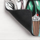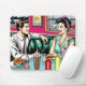 Retro pop art comic book style mouse pad. Cute 1950's era couple sitting in a diner with milkshakes, fries and cheeseburgers on a date. Colors used are teal, pink, red, black and yellow. Old-fashioned nostalgia. This picture is hand drawn by myself.