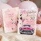 Personalize this fun pinky pink and black retro 1950's glam aesthetic Fifty and Fabulous 50th birthday party invitation (personalize for any birthday year!) featuring vintage old Hollywood glamour style and cocktail vibes with watercolor vintage hot pink Cadillac car, and pinup girl martini glass details over a soft blush pink and ivory watercolor background! Easily add your party details to make it uniquely yours. You are welcome to make your own edits and correct wording spacing by clicking the "edit using the design tool" link at the bottom right corner of the "personalize this template" window - click "done" when finished. Custom design requests, product additions to the collection, and invitation template questions are always welcome - click the "message" button or email direct at: contact@figandlilyco.com ♥ Design lovingly created by Fig and Lily Studios - sending blessings and thanks for being here with us!
