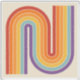 This artwork channels a retro graphic spirit, forming the letter‑like curve with parallel bands of red, orange, yellow, light blue, teal, and purple. The layered arcs flow in harmony, evoking the bold optimism of 1970s design. Set against a soft beige background, the vibrant rainbow palette stands out with clarity and rhythm. The composition balances simplicity and dynamism, creating a timeless visual that feels both nostalgic and modern.