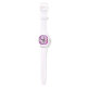 A retro style girly musical design in shades of pink and purple featuring a large treble clef and music notes on a hypnotic circle and wavy lines pattern.