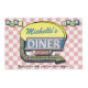 Create your own custom, 1950's style diner sign placemat using this template. These cool retro placemats have a slightly distressed pink-and-white checkered background with a sign on top that says "DINER" and "OPEN" in neon with space for you to add your own first or last name - or any other word you'd like. Add the year your diner was established and a slogan, too. The sign also has a lighted arrow graphic. The colors are done in shades of pink, white, black, blue, yellow, gray and red.