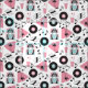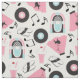 Fun vintage fabric pattern featuring poodle skirt, juke box, records, music notes and milk shake elements in shades of pink, black and teal. Perfect for retro themed sock hop projects.