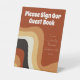 This groovy retro wedding guest book pedestal sign features wavy lines in tan, brown, and orange, reminiscent of the 70s and hippie lifestyle. Bold vintage decor with funky white script next to the abstract curvy lines. Groove along with these fun earth tones. Please sign our guest book.