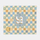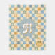 Cozy fleece blanket with a retro checkered pattern in soft boho yellow and blue, featuring smile faces and space to add your name and initial. A fun, modern, hippie 70s-inspired gift for kids, teens, or cozy nights in.