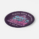 80's Party paper plate featuring a retro style typography of '80's Party''. Designs include elements of dark purple, blues, and pinks, sci-fi futuristic elements from the 80s, triangle and grid. Customize with event and date.