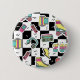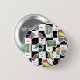 A bold retro-inspired button featuring a lively pattern of roller skates, cassette players, and vintage tech icons.
