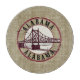 Rustic look glass cutting board feature faux burlap background with round travel style stamp of the Mobile Alabama bridge in silhouette. Great kitchen gift idea!