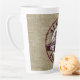 Classic tall latte mug feature faux burlap background with travel style stamp of the Mobile Alabama bridge in silhouette.