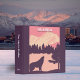 Modified, retro, Alaska travel poster for front of this travel scrapbook and/or photo album. The image is of a large wolf standing on a rock of a mountainous area with a backdrop of pine trees and huge snow covered mountains. The image is modern with colors of shades of pink and deep purple, with white and deep purple text. Binder has a matching purple background. Templates provided on spine. Perfect for your vacation scrapbook memories and/or photos from a trip to Alaska.