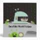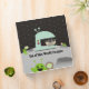 Very cute baking scene recipe cookbook binder with retro alien stand mixer whipping up something sweet for little green aliens on a moon background with craters. Smiling aliens have cookies and cupcake. Cute binder for general cooking or baking.