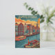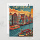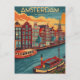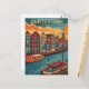 Take a whimsical trip through time with this delightful Postcard! Immerse yourself in the charm of Amsterdam's iconic canals and vibrant flower markets, all rendered in a captivating retro style. This nostalgic illustration showcases blooming tulips, charming houseboats, and the city's unique atmosphere.