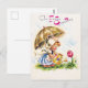 A retro An Easter Greeting with a cute cartoon woman watering tulips in the rain