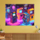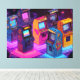 A group of vintage arcade machines stands illuminated by vibrant neon lights. The scene is set against a backdrop of a starry galaxy, creating a nostalgic yet futuristic atmosphere.
