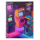 A group of vintage arcade machines stands illuminated by vibrant neon lights. The scene is set against a backdrop of a starry galaxy, creating a nostalgic yet futuristic atmosphere.
