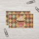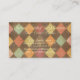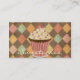 Retro Argyle Cupcake Bakery business card. Front and back feature muted but colorful argyle pattern with brown base. Cover features a large cupcake and company name with a 3d look. Backside has space for company details. Very retro feel.