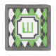 Argyle goes retro 8-bit with this green, gray, white, and black color scheme which hearkens back to old-school arcade games. Customize this lapel pin with your own initials.