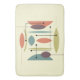 This cool happening mid century modern inspired art has simple shapes with bold 1950s vintage style colors of orange, chartreuse and turquoise, with a light yellow background.