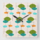This Retro Atomic Mobile Pattern Square Wall Clock is mid century modern style at its finest. The vintage inspired design features a cream background with colorful pointed ovals in turquoise, orange, teal, and avocado green. The teal and avocado green ovals overlap creating a lovely shade of peacock blue. Fun starbursts accentuate slanting and straight lines, which connect the shapes forming a kitschy mobile pattern. This mod design pairs exceptionally well with StrangeLittleOnion’s Retro Grid and Starburst products.