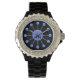 Hip 1950's looking watch face featuring an original digital painting of 12 glossy, plastic looking periwinkle-blue balls attached to 12 silvery rods on a black background. Topped off w/ 2 custom text fields for your initials.