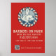 Stylish poster with red white and blue retro style barber badge on red background. Customize with barbershop name and details, and add your custom QR code for your website or social media accounts.