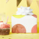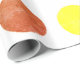 This cool retro design features large grungy distressed polka dots in yellow and shades of orange brown and red, on a white background.