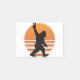 Very cool bigfoot sasquatch yeti cartoon walking and holding up a peace sign, with a retro sunset, aged grungy style design.