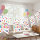 This bunting flag design features a cheerful "Happy Birthday!" greeting in a fun, nostalgic style with a variety of vibrant colors. The white background is covered in a playful mix of multi-colored dots and retro starbursts that look like tossed confetti. With its classic triangular shape and bright shades of teal, pink, orange, and purple, this banner adds a high-energy look to any party space. It captures a simple, vintage midcentury vibe that works perfectly for a festive celebration. These flags are a great way to bring a pop of color and a classic party feel to your walls or doorways.
