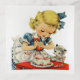 Little Girl and the Cake - A retro birthday card from the 50s with a little girl decorating a cake with her little kitty cat.