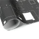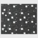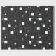 This image features a modern, abstract geometric pattern in black and white. It consists of various-sized squares and rectangles arranged randomly across a black background. Some shapes are solid white, while others are outlined, creating a layered effect. Small dots and pixel-like elements are scattered throughout, adding depth and texture. The overall design is minimalistic and conveys a digital or futuristic aesthetic.