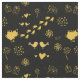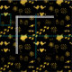 Retro black and yellow pattern of birds, dots, footsteps, flowers, hearts, butterflies.