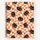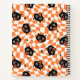 This vintage-inspired pattern features charming black cat faces with large, wide eyes and open mouths, giving them an expression of surprise or excitement. The cats are set against a vibrant, retro orange and cream checkered background with a wavy, distorted effect, evoking a sense of playful movement. Small black stars are scattered throughout the design, adding an extra element of whimsy and nostalgia. The combination of the classic Halloween colors and the bold, stylized cat faces creates a fun, slightly spooky aesthetic that harkens back to mid-century vintage design.