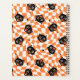 This vintage-inspired pattern features charming black cat faces with large, wide eyes and open mouths, giving them an expression of surprise or excitement. The cats are set against a vibrant, retro orange and cream checkered background with a wavy, distorted effect, evoking a sense of playful movement. Small black stars are scattered throughout the design, adding an extra element of whimsy and nostalgia. The combination of the classic Halloween colors and the bold, stylized cat faces creates a fun, slightly spooky aesthetic that harkens back to mid-century vintage design.