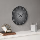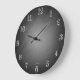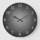 This fun clock features a background design made to look like an old black chalkboard that's been written on and erases many times and has a vignette look. The design fades from dark black on the outside to lighter in the middle. The hours are marked with gray letters in a fun font with a hand sketched look.