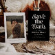 Retro and elegant save the date card featuring boho font that says "save the date" in white on a black background. You can add a photo on the back.