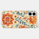 A seamless pattern of oversized retro-inspired flowers in bright orange, deep navy blue, and golden yellow, accented with leafy vines and tiny blossoms on a warm cream backdrop.
