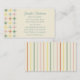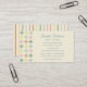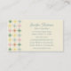 Geometric depictions of daisies in muted shades of light blue, dark green, pink, rust orange and yellow are set against a sand or beige colored background for a simple, retro look on these custom business cards. Your name and contact details appear in soft light blue lettering.