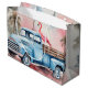 Watercolor retro blue pickup truck with flamingo and palm trees