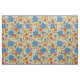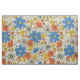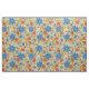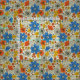 This fabric has a retro floral pattern that features flowers and leaves in shades of orange, blue and yellow.
