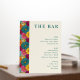 This is a modern style image featuring a beautifully designed bar menu with a colorful floral border on the left side. The flowers are in shades of pink, orange, yellow, and teal, creating a lively and inviting atmosphere. The right side lists various beverages including beer, wine, and spirits in an elegant font, making it easy to read and visually appealing. Perfect for adding a touch of nature-inspired elegance to any dining or social setting.