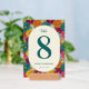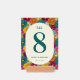 This is a whimsical style image featuring an elegant table number card surrounded by a vibrant array of colorful flowers. The central focus is the large, stylish teal "8" set against a soft cream background, with the names "Lauren & Benjamin" and the date "May 23, 2026" below it. The border is adorned with a lively mix of daisies in shades of pink, orange, yellow, and blue, creating a cheerful and inviting atmosphere perfect for a wedding or celebration. It inspires feelings of joy and festivity, making it ideal for adding a touch of natural beauty to any event.