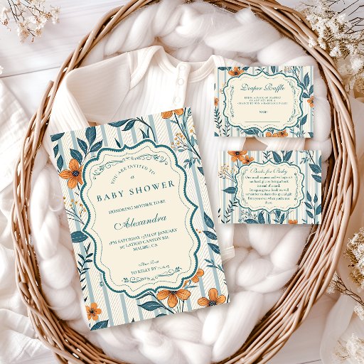 This soft blue botanical design blends vintage charm with timeless elegance, creating a beautifully refined baby shower aesthetic. Hand-drawn florals frame a delicate striped center panel, giving the layout a classic and graceful feel. The palette is soothing and refined, making it perfect for celebrating a mother-to-be in style. Personalize the event details to craft a meaningful and polished keepsake.
