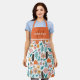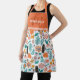 Multi colored apron perfect for fall with a pattern of flowers, leaves, and bugs in a whimsical style. Add your name and monogram on the orange top of the apron.