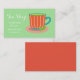 A cute vintage retro style business card suitable for a café - either mobile café or coffee or specialty tea shop. This whimsical design shows an illustration of a cute retro tea cup against a green mint background. The background colour can be changed to suit your taste. This business card is fully customisable to include your own personal details.